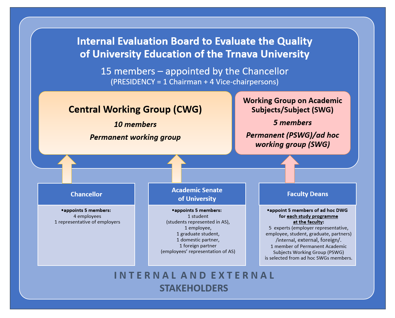 The Internal Evaluation Board of the Quality of University Education of the Trnava University (hereinafter referred to as the “IQAB”) is a permanent academic body of the University, which is an independent structure of the internal system of the University with scope of powers and responsibilities established by the Statute of the IQAB in accordance with the standards of quality of education.