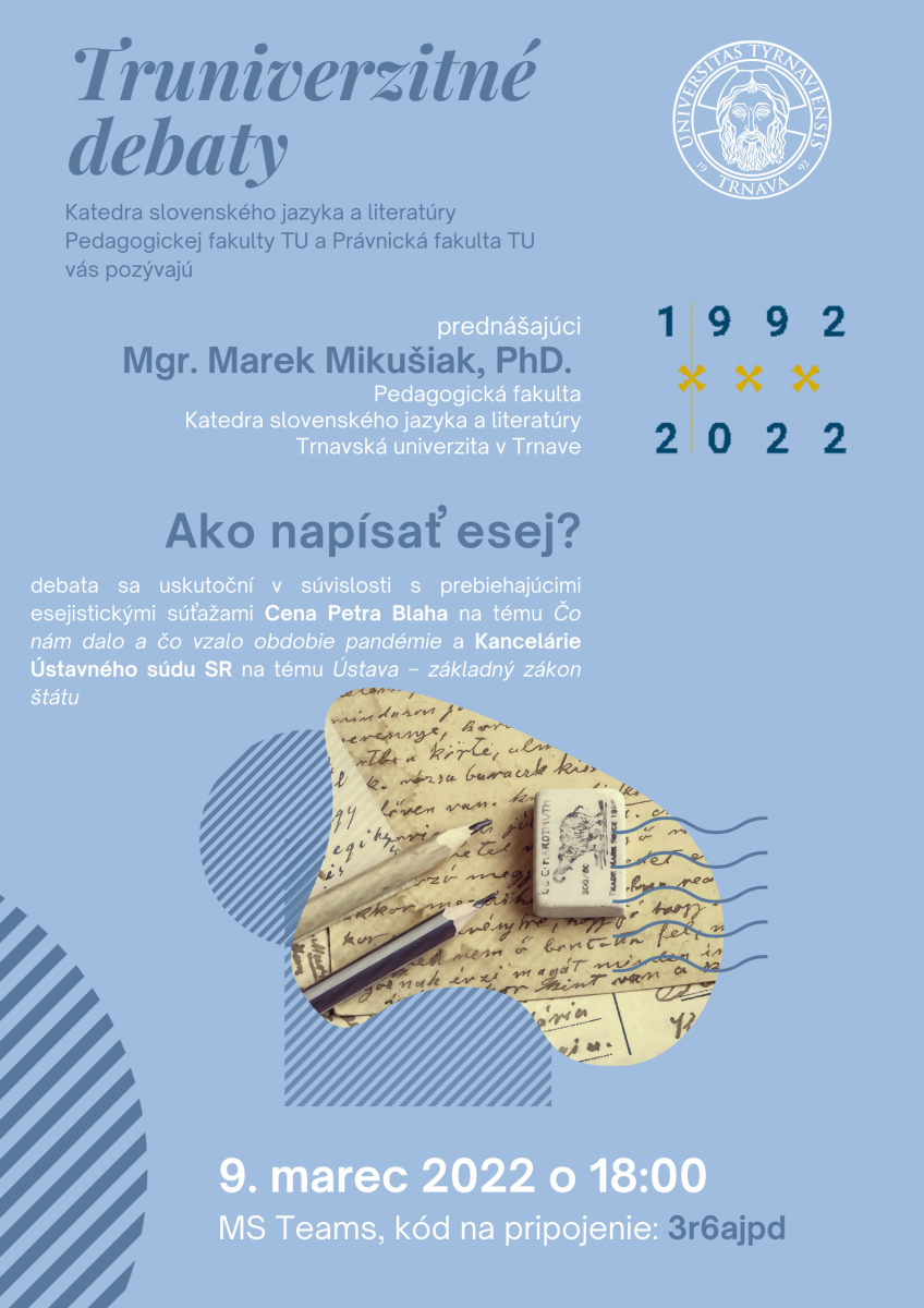 Dovoľte, aby sme vás v spolupráci s Katedrou slovenského jazyka a literatúry Pedagogickej fakulty TU pozvali na prvú truniverzitnú debatu v tomto semestri, ktorá sa uskutoční v súvislosti s vyhlásenou esejistickou súťažou Kancelárie Ústavného súdu Slovenskej republiky pri príležitosti 30. výročia prijatia Ústavy SR na tému: „Ústava – základný zákon štátu“.
