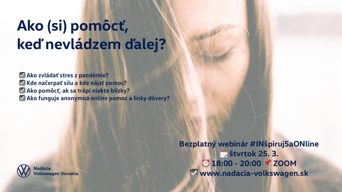 Nadácia Volkswagen Slovakia organizuje v rámci cyklu prednášok ##INšpirujSaONline online webinár s názvom Ako (si) pomôcť, keď nevládzem ďalej?, kde hostkou bude aj naša kolegyňa Mgr. Iveta Schusterová PhD. z katedry psychológie.
