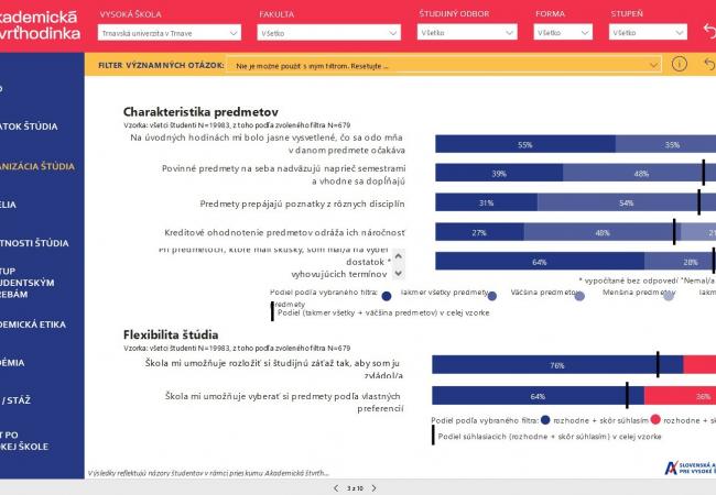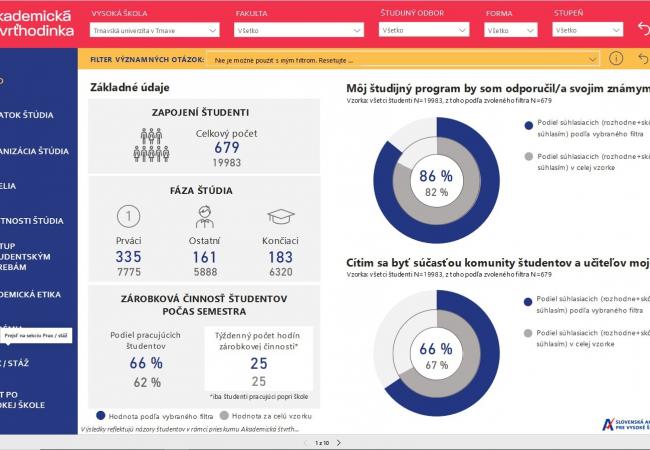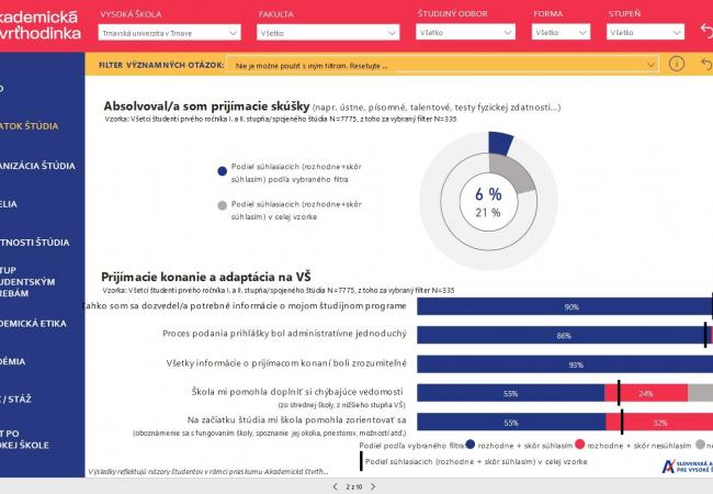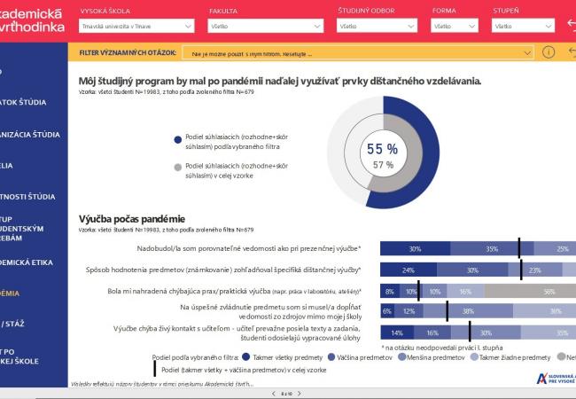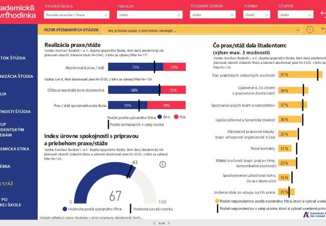 Interaktívna aplikácia dostupná na https://prieskum.saavs.sk/vysledky/ umožňuje on-line zobraziť obraz názorov študentov jednotlivých vysokých škôl, fakúlt, odborov či stupňov a foriem štúdia. Celoslovenský výsledok získaný z celej vzorky respondentov je uvádzaný pre porovnanie sivou farbou, resp. hrubou čiernou zvislou čiarou.