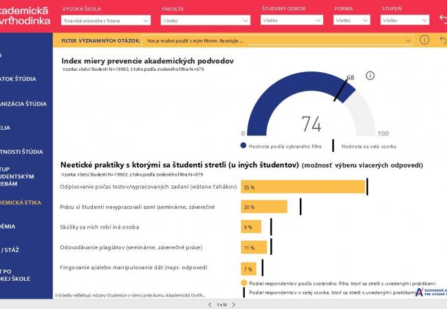 Podobne index miery prevencie akademických podvodov s hodnotou 74 na TU je vyšší ako hodnota za celú vzorku, akademická etika je teda vnímaná našimi študentmi na vysokej úrovni. Študenti TRUNI tiež kladne vnímajú podporu poskytovanú študentom a služby pre študentov, učitelia podľa študentov vo vyššej miere premietajú potreby praxe do výučby, pričom praxí a stáží sa študenti TU zúčastňujú významne viac v porovnaní s podielom súhlasiacich v celej vzorke.