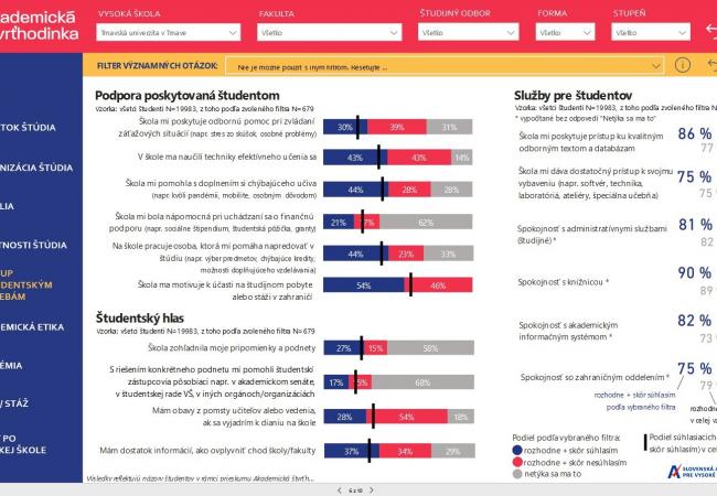 Použité obrázky vo fotogalérii vyjadrujú prehľad vyhodnotení názorov študentov TU v deviatich najvýznamnejších okruhoch – začiatok štúdia, organizácia štúdia, učitelia, vlastnosti štúdia, prístup k študentským potrebám, akademická etika, pandémia, prax/stáž a život po vysokej škole za TU ako celok.