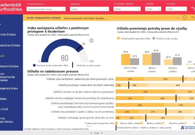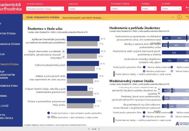 Študenti TU sú spokojnejší z hľadiska flexibility štúdia a študijnej záťaže, ako aj organizácie jednotlivých predmetov a ich obsahu, ktorý je v rámci študijných programov dobre prepojený. Kým index zastúpenia učiteľov s pozitívnym prístupom k študentom má celoslovenskú hodnotu 75, na Trnavskej univerzite je to 80, a študenti vnímajú výraznejšie aj pomoc od učiteľov pri napĺňaní ich potenciálu o 7% viac ako zúčastnení respondenti z celkového súboru.