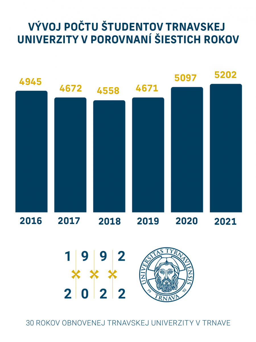 Nehovoriac o tom, že v sledovanom období oproti najnižšiemu počtu študentov (rok 2018) sa naša univerzita rozrástla o 644 poslucháčov viac (čo je viac ako o 14%). Sú to výborné výsledky, za ktorými stojí výnimočná kvalita vzdelávania, vedy a výskumu na Trnavskej univerzite, tvrdá a poctivá práca, no predovšetkým silné tradície akademického života v Trnave.