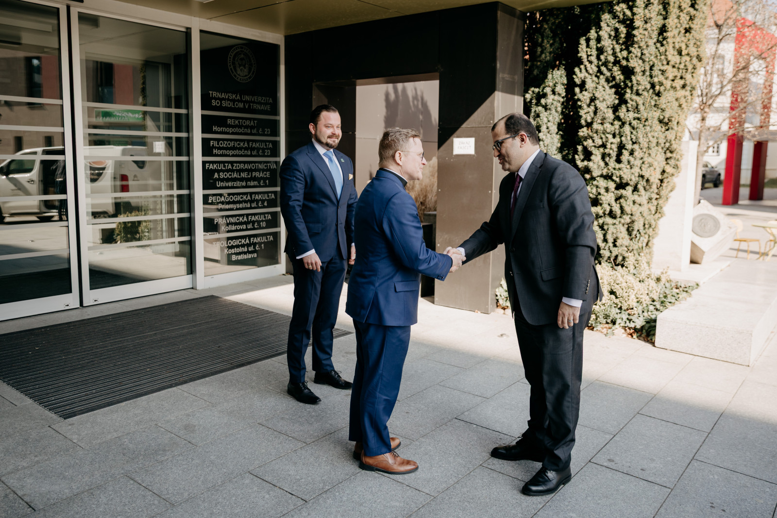 Spoločný rozhovor, ktorý prebiehal v duchu úprimného dialógu a v priateľskej atmosfére, priniesol viaceré možnosti medzinárodnej spolupráce s prepojením oblastí vzdelávania, diplomacie a tretieho sektora. Pán veľvyslanec Hindawi ocenil možnosť prvýkrát od začiatku svojej misie navštíviť mesto Trnava a rektorát Trnavskej univerzity, ktorá svoju misiu v oblasti vzdelávania začala už takmer pred 400 rokmi.