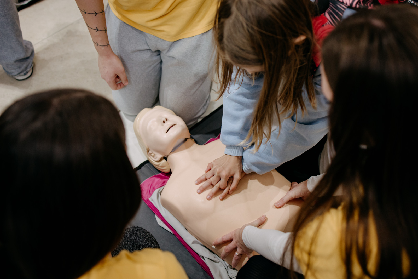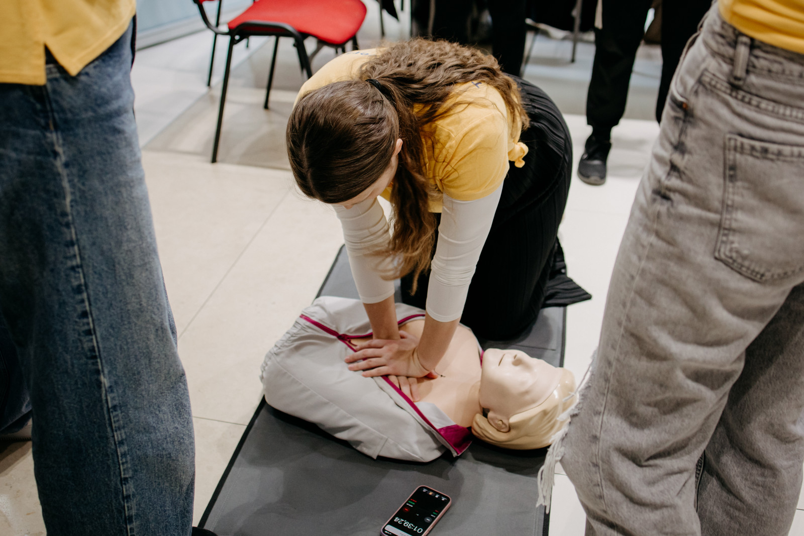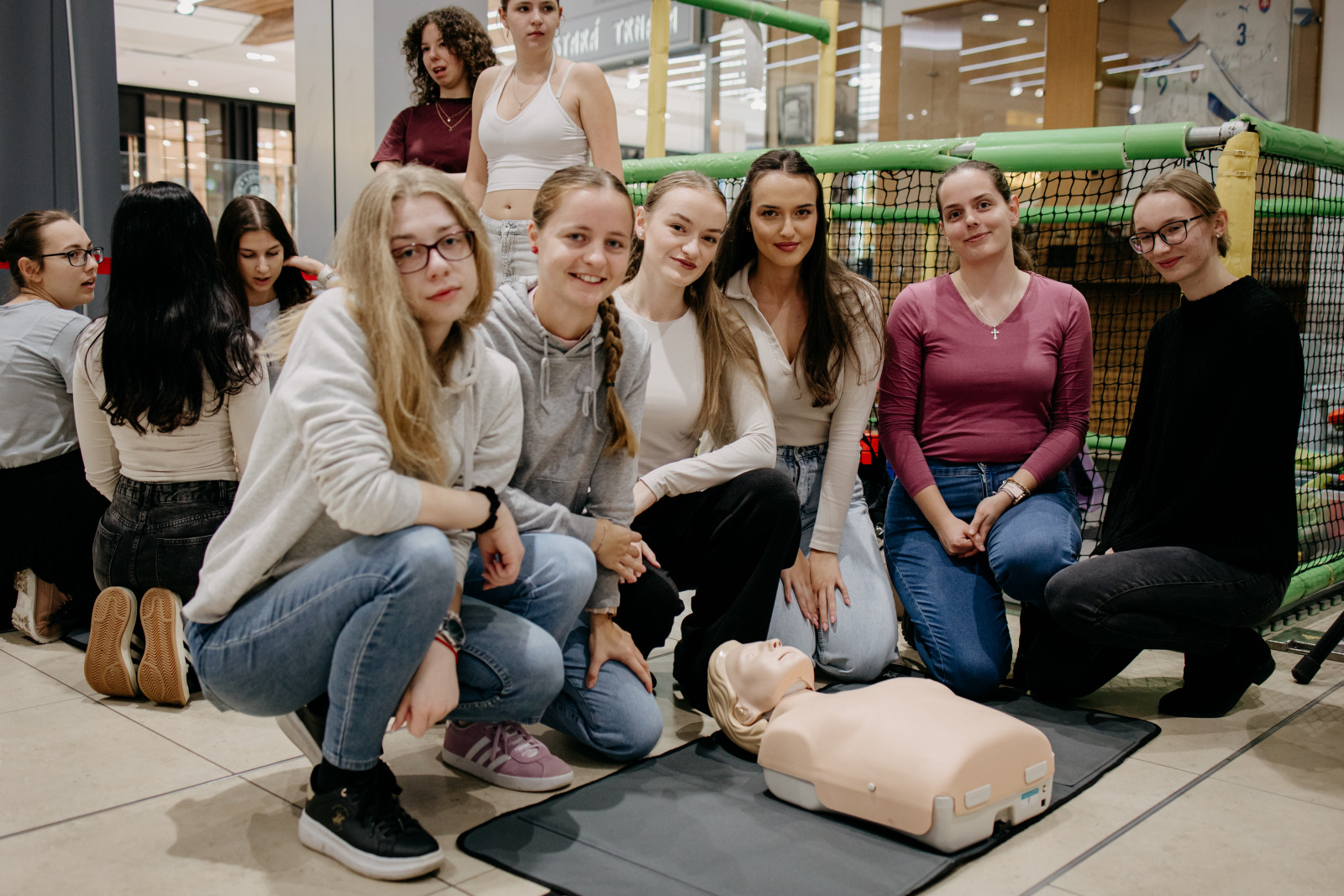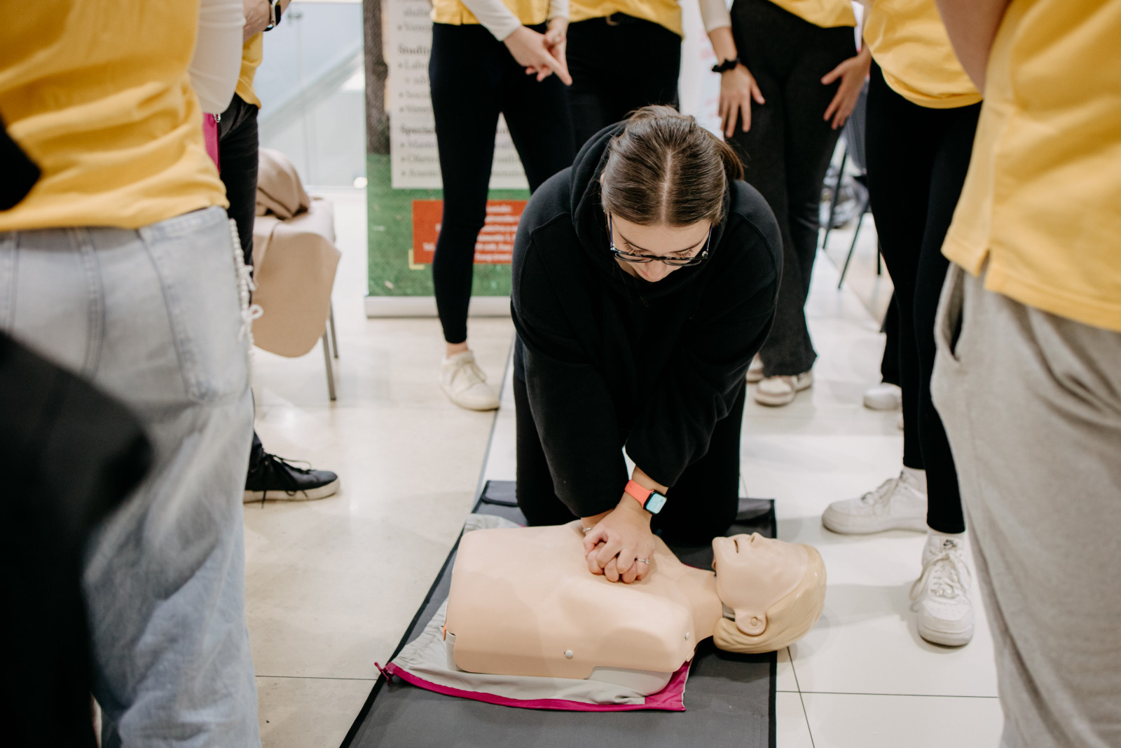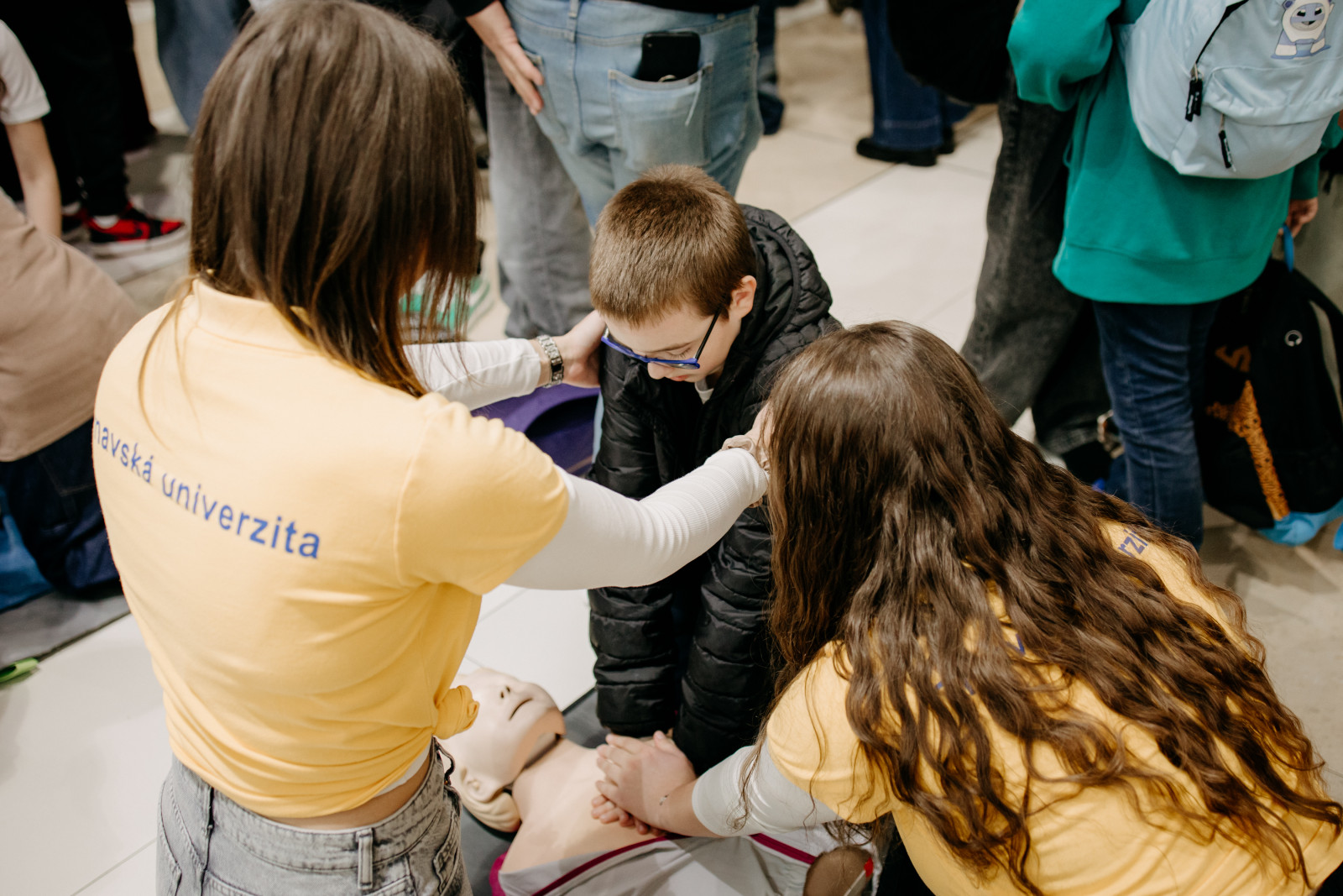 Aj my, študenti 3. ročníka bakalárskeho odboru Ošetrovateľstvo sme sa aktívne zapojili do výučby základov prvej pomoci. Učili sme ľudí, ako správne reagovať v prípade zástavy srdca, a umožnili im vyskúšať si KPR na figurínach pre dospelých aj detí.
